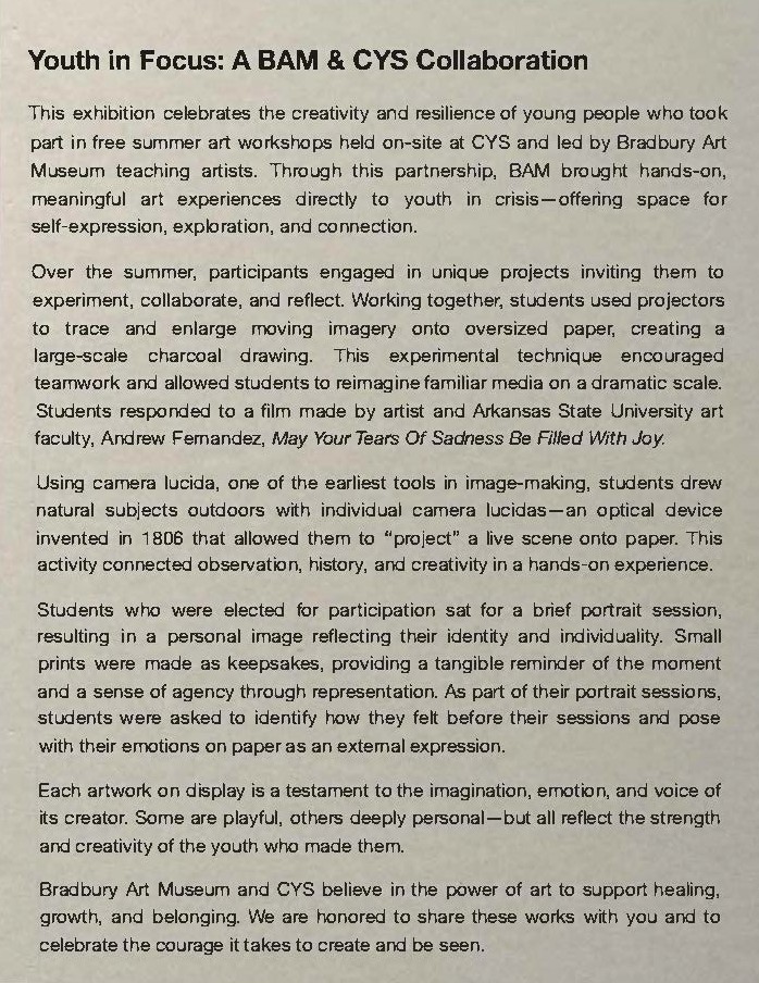 This summer, CYS partnered with the Bradbury Art Museum to bring free, hands-on art workshops to youth in crisis. The exhibition showcases powerful works created through collaboration, reflection, and self-expression—celebrating the courage, creativity, and resilience of every young artist.